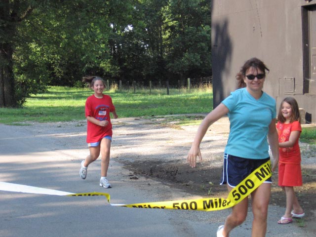 finished her 500th mile, her daughters Amanda and Julia cheered