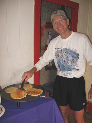 conversation and eat pancakes, sausage, fruit, homemade breads, and