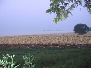field along course on foggy morning